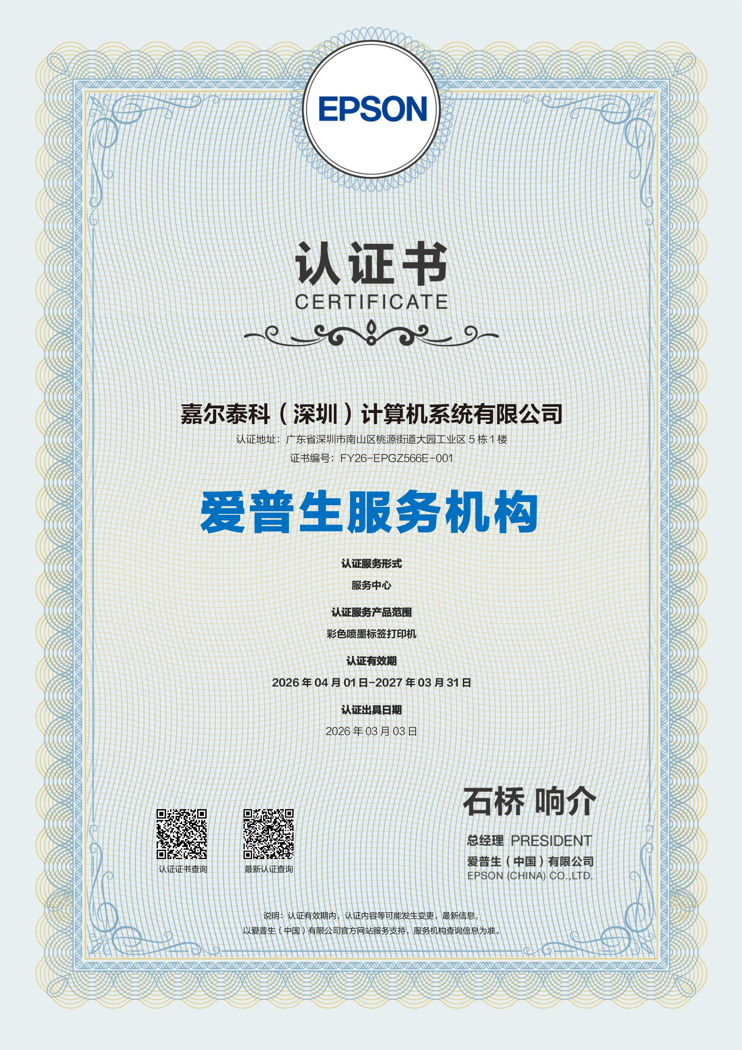 | | | | | EPSON 认证“嘉尔泰科(深圳)计算机系统有限公司”为“爱普生服务机构” 认证服务形式:服务中心;认证服务产品范围:彩色喷墨标签打印机;认证有效期2026年4月1日-2027年3月31日 |