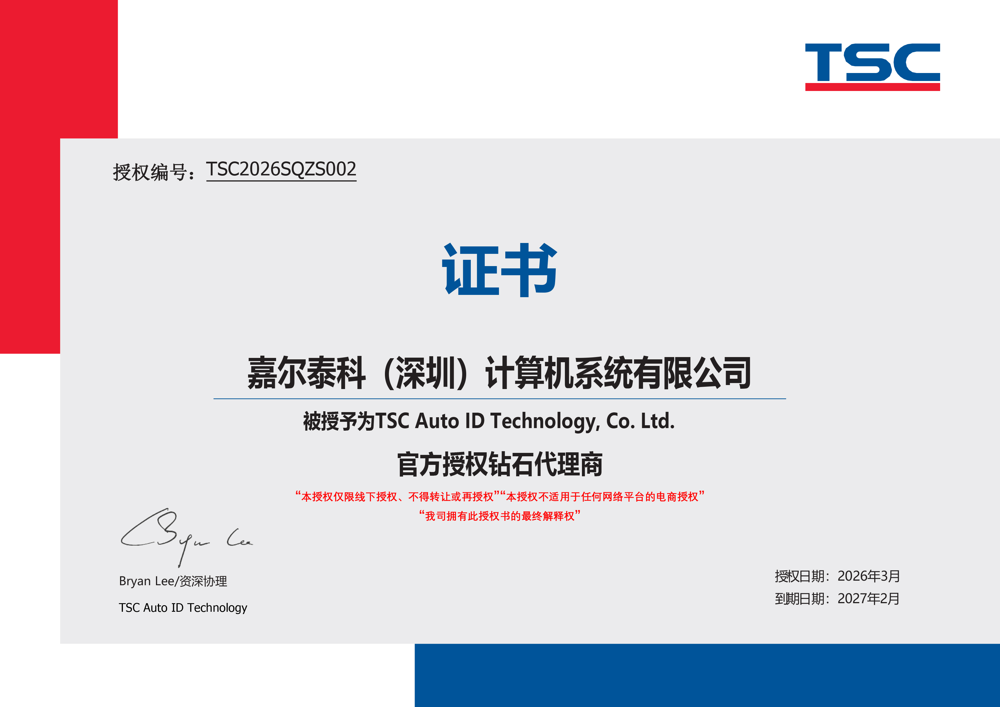 | | | | | 嘉尔泰科(深圳)计算机系统有限公司被认授予为 TSC Auto ID Technology,Co.Ltd.官方授权钻石代理商。授权有效期:2026年03月1日-2027年02月28日 |